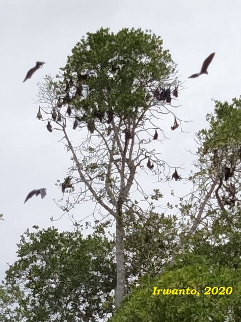 Saat senja tiba, ribuan kelelawar Seram (Pteropus ocularis) terbang dari tajuk mangrove menuju Pulau Seram untuk mencari makan. Siang hari mereka bergelantungan di pohon-pohon mangrove.